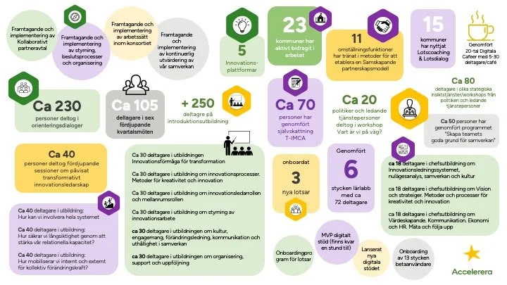 Accelerera, tillsammans med deltagare i olika format, har samskapat och utvecklat värde för klimatomställningen, presenterat i illustrationen nedan.